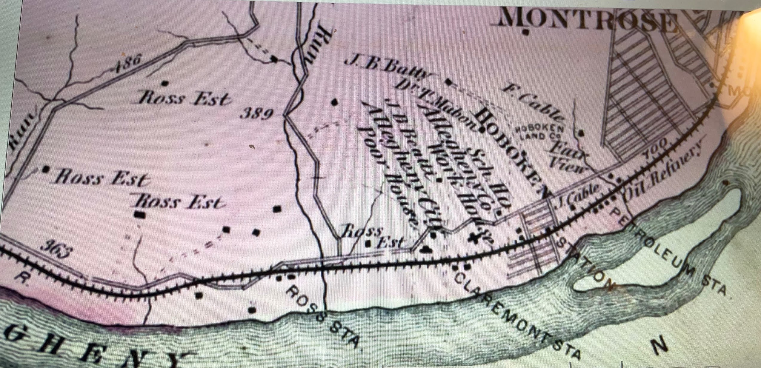 Close up of a 1879 O'Hara Township map Showing Claremont Station and the Poor House (City Home) |